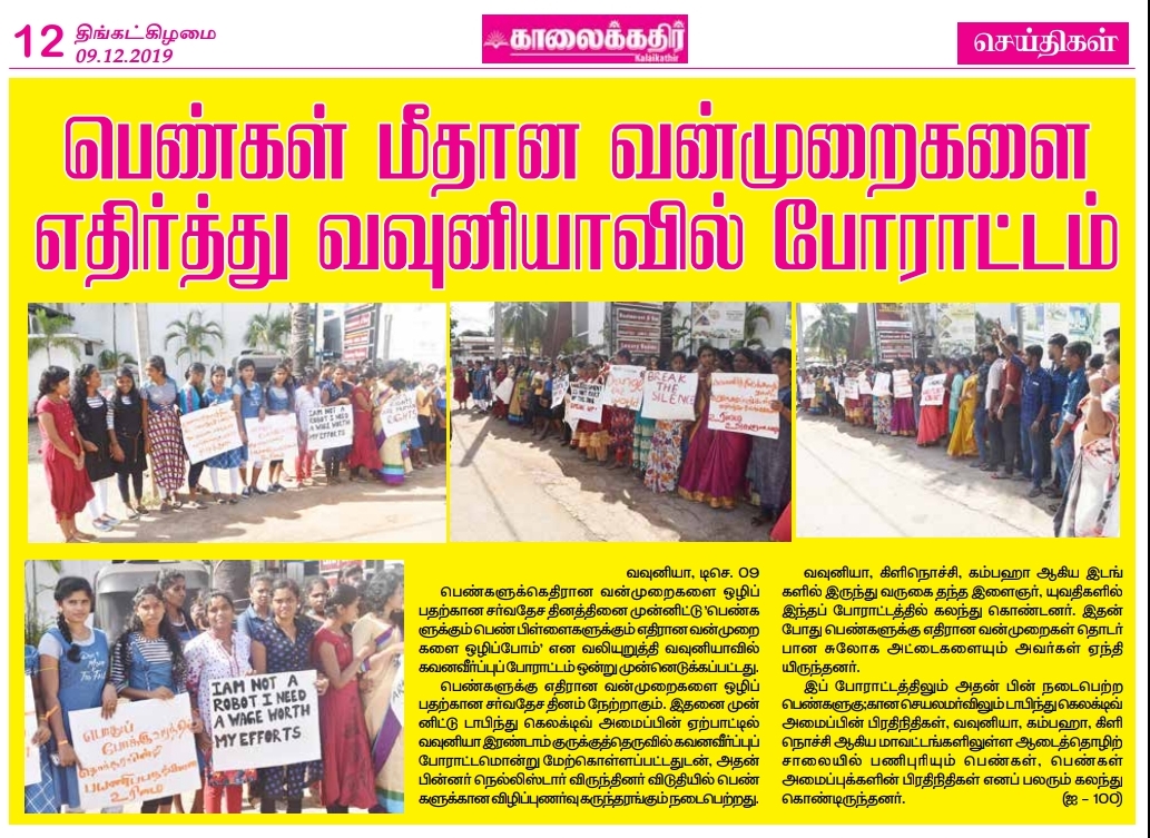 We look forward to celebrating 16 Days activism for violence against women on the 8th of December in Vavuniya on collaboration with 150 women workers in Kilinochchi and Vavuniya and civil society as we have been doing annually. A special speech to motivate women workers on their basic rights and make them aware of such rights will be presented at the event. Women workers from Kilinochchi and Vavuniya will be sharing their personal experiences as well. We hope to invite the media to give us coverage during the program. In addition to that, we formed vital demands to be promoted on the day of the program and they are as follows.