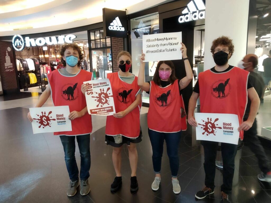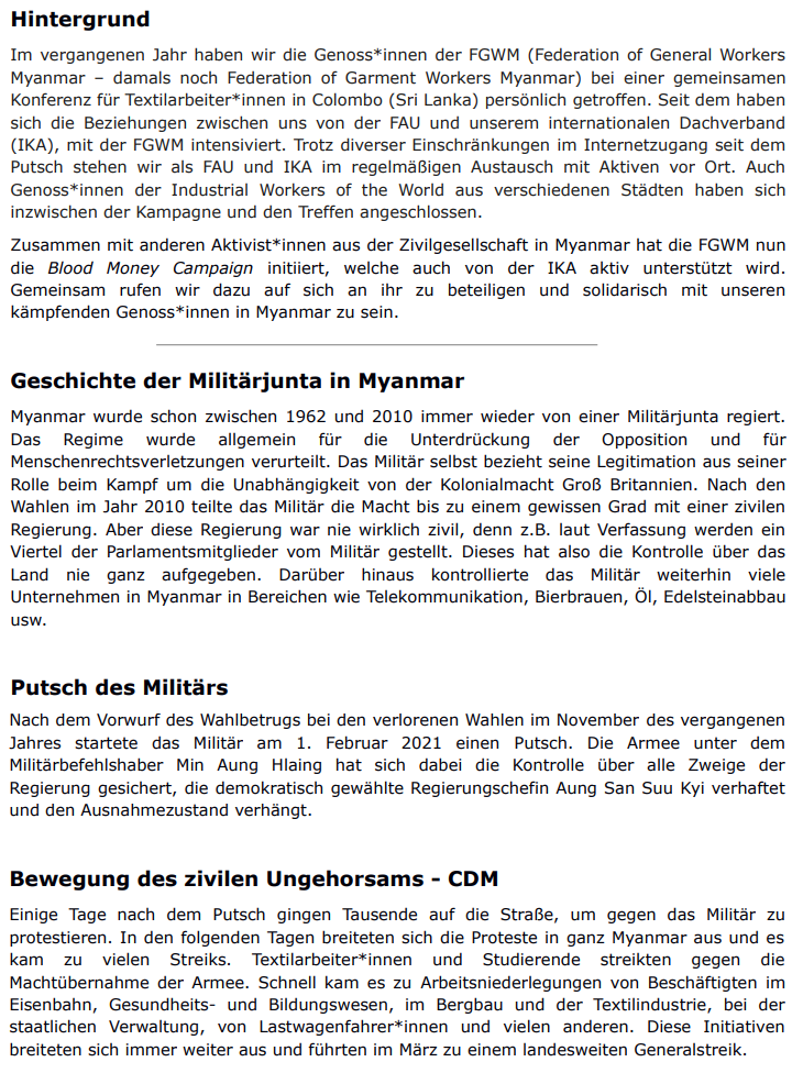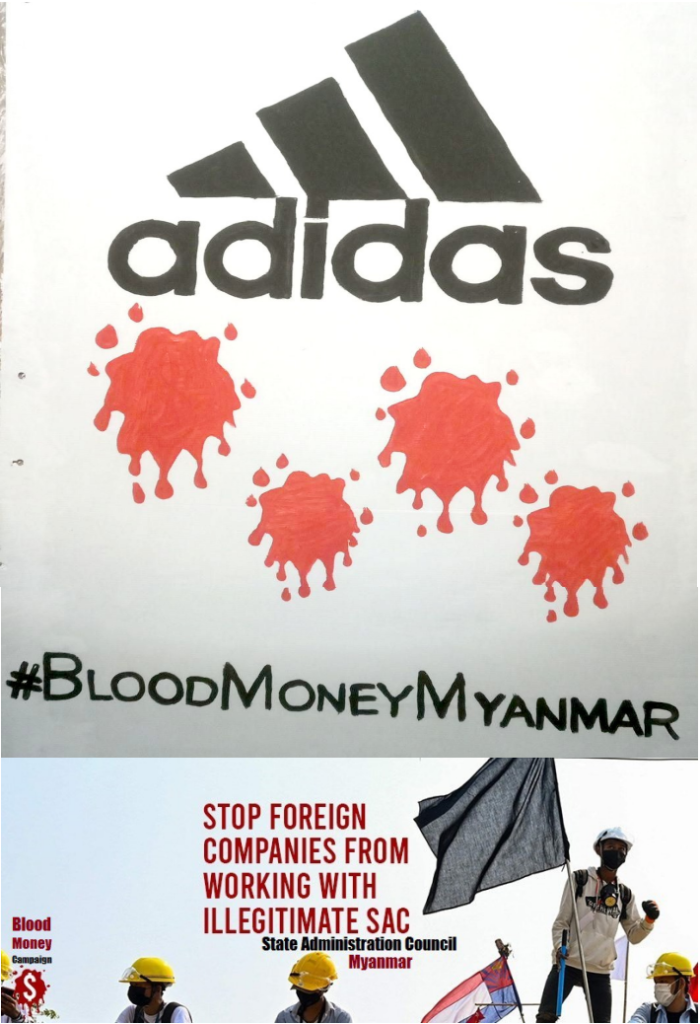 Um der Militärjunta die Finanzquellen abzuschnüren, haben Akteur*innen der Zivilgesellschaft sowie die FGWM die Blood Money Campaign initiiert. Mit dieser sollen Unternehmen, die weiterhin in dem Land Geschäfte betreiben und somit auf direkte oder indirekte Weise das Militär finanziell unterstützen, unter Druck gesetzt werden, ihre Investitionen abzuziehen. Neben Firmen wie der Deutsche Post DHL Group, Primark, H&M und Volkswagen, gehört auch Adidas dazu.