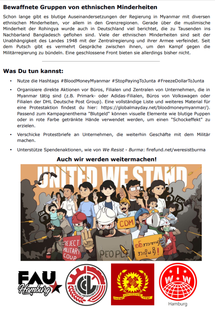 Deshalb veranstalteten wir zusammen mit der Ortgruppe der IWW eine mehrstündige Kundgebung vor dem Adidas-Geschäft in der Mönckebergstraße letzten Sonnabend. Mehr als 300 Flyer wurden unter Leute gebracht und eine Audio-Botschaft von Genoss*innen in Myanmar mehrmals abgespielt. Flyer und Botschaft findet ihr auch weiter unten. Die Filialleitung fand das Ganze gar nicht witzig, versuchte uns einzuschüchtern und war recht ungehalten. Nach Rücksprache mit der Adidas-Zentrale nahm die zuständige Person aber doch den Flyer mit den Kontaktdaten von den Initiator*innen der Blood Money Campaign und uns an.