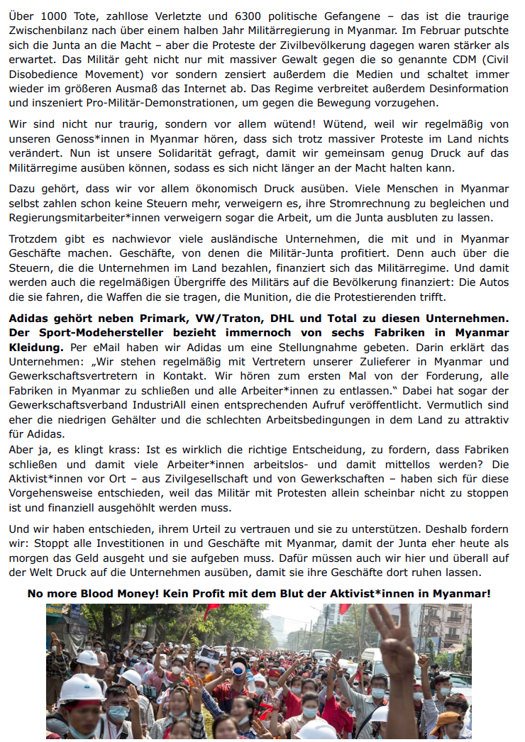 Wir erwarten von Adidas eine öffentliche Stellungnahme! Das Unternehmen bezieht weiterhin Klamotten aus sechs Fabriken in Myanmar und betreibt Läden in dem Land. So lange die Militärdiktatur herrscht, ist das nicht akzeptabel.
