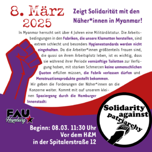 In Myanmar herrscht seit über 4 Jahren eine Militärdiktatur. Die Arbeitsbedingungen in den Fabriken, die unsere Klamotten herstellen, sind extrem schlecht und besonders Hygienestandards werden nicht eingehalten. Da die Arbeiter*innen größtenteils Frauen sind, die quasi an ihrem Arbeitsplatz leben, ist es wichtig, dass sie während ihrer Periode vernünftige Toiletten zur Verfügung haben, mit starken Schmerzen keine unmenschlichen Produktionsquoten erfüllen müssen, die Fabrik verlassen dürfen und Menstruationsprodukte gestellt bekommen.