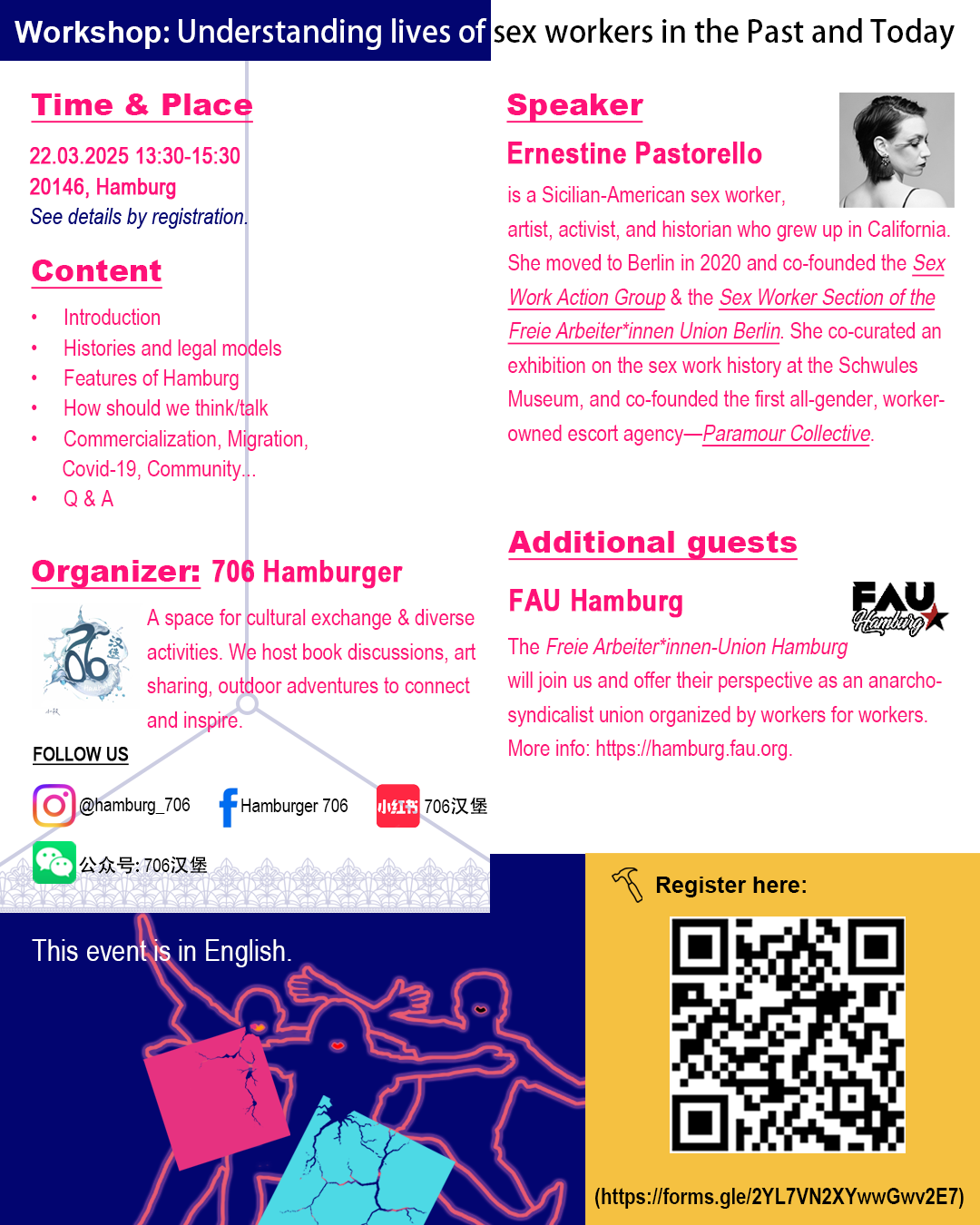Am 22. März wird die FAU Hamburg an einem Workshop mit dem Titel „Understanding Sex Work: Realities, Histories, and Rights“ in Zusammenarbeit mit dem Community-Kollektiv 706 Hamburger teilnehmen. Ernestine Pastorello, eine leidenschaftliche Aktivistin und Historikerin, wird von ihrer eigenen Arbeit erzählen und über Sexarbeit in Deutschland und speziell in Hamburg berichten.