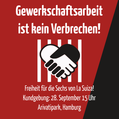 Freiheit für die 6 von La Suiza! Gewerkschaftsarbeit ist kein Verbrechen! Ein Angriff auf eine von uns ist ein Angriff auf uns alle!
