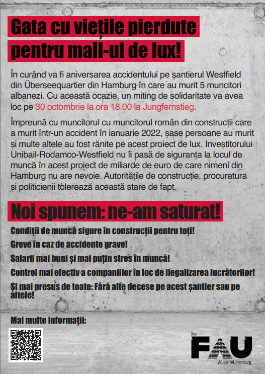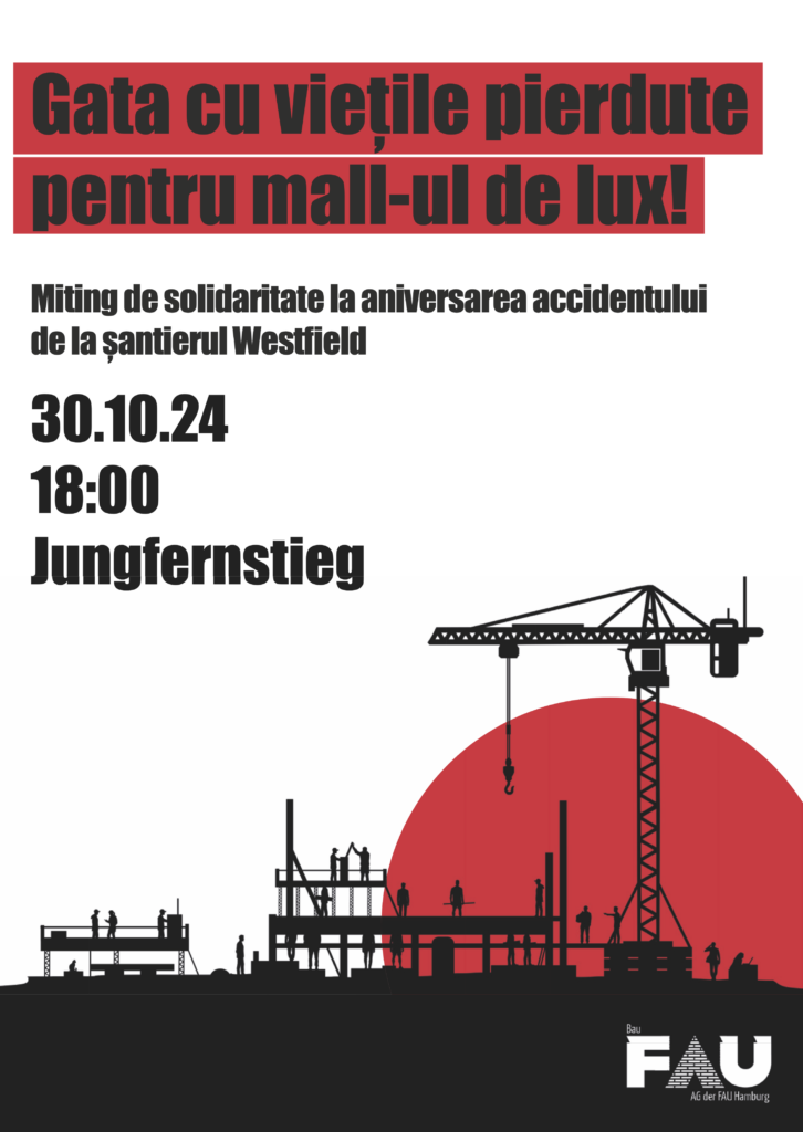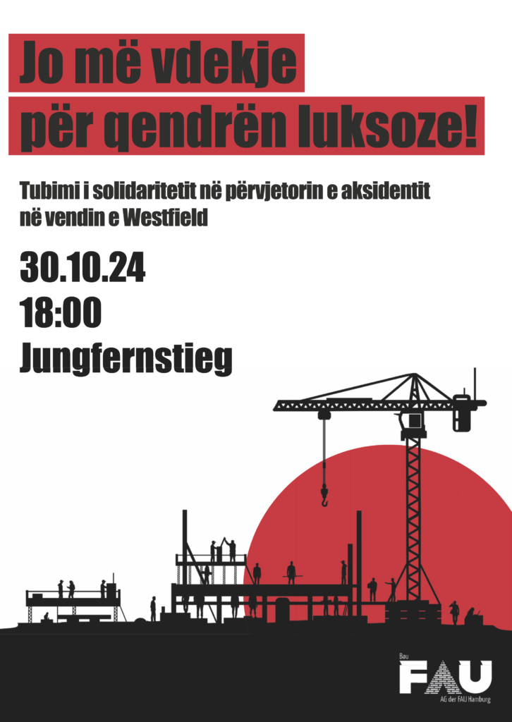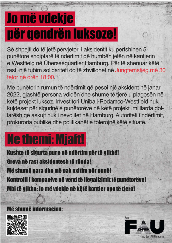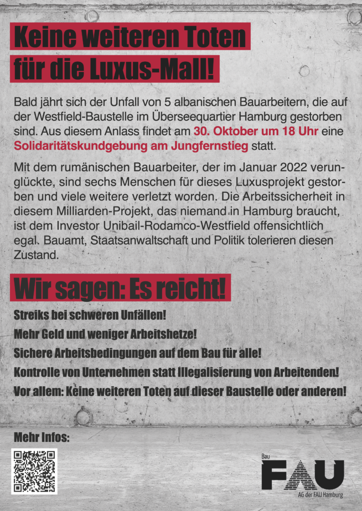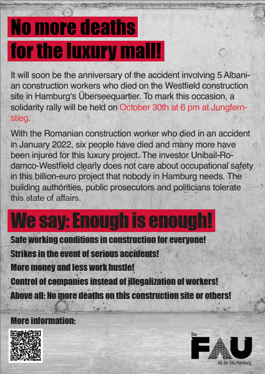 It will soon be the anniversary of the accident involving 5 Albanian construction workers who died on the Westfield construction site in Hamburg’s Überseequartier. To mark this occasion, a solidarity rally will be held on October 30 at 6 pm at Jungfernstieg. With the Romanian construction worker who died in an accident in January 2022, six people have died and many more have been injured for this luxury project. The investor Unibail-Rodamco-Westfield clearly does not care about occupational safety in this billion-euro project that nobody in Hamburg needs. The building authorities, public prosecutors and politicians tolerate this state of affairs. We say: Enough is enough!
