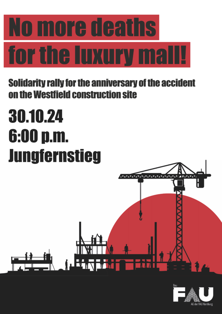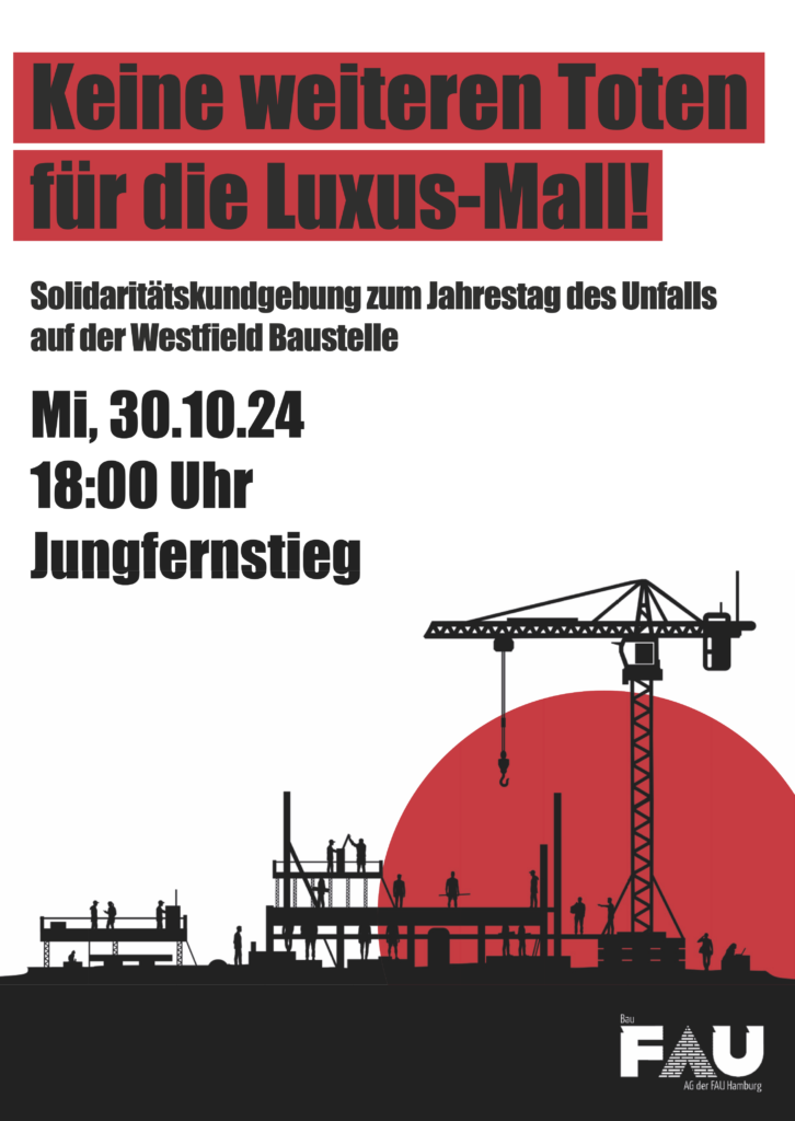 Wir, die Bau FAU der Freien Arbeit*innen Union (FAU) Hamburg, fordern von dem verantwortlichen Investor Unbail-Rodamco-Westfield (Dirk Hünerbein, Projektleitung des Westfield-Überseequartier), der HafenCity GmbH (Theresa Twachtmann, Geschäftsführerin der HafenCity GmbH) und den anderen Verantwortlichen und Zuständigen in Politik (Karin Pein, Senatorin für Stadtentwicklung und Wohnen), Verwaltung (Herr Munske, Amt für Bauordnung und Hochbau, Herr Klaus, Oberste Bauaufsicht) und Justiz, dass die Großbaustelle des Überseequartiers sofort geschlossen wird. Keine weiteren Toten für die Luxus-Mall!