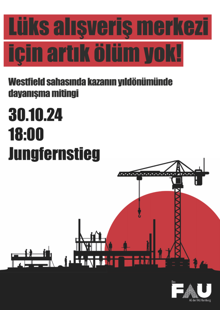 Biz, Bau FAU der Freien Werk*innen Union (FAU) Hamburg olarak, sorumlu yatırımcı Unbail-Rodamco-Westfield’den (Dirk Hünerbein, Westfield-Überseequartier proje müdürü), HafenCity GmbH’den (Theresa Twachtmann, HafenCity GmbH Genel Müdürü) ve siyasetteki diğer sorumlu ve sorumlu kişilerden (Karin Pein, Kentsel Gelişim ve Konut Senatörü), idareden (Bay Munske, Bina Düzenlemeleri ve İnşaat Ofisi, Bay Klaus, Yüksek Bina Denetimi) ve Überseequartier’in ana şantiyesinin derhal kapatılacağı yargısı. Lüks alışveriş merkezi için daha fazla ölüm yok! Westfield şantiyesindeki insanlık dışı çalışma koşullarına son verilmelidir. Örgütlenin ve daha iyi çalışma koşulları için birlikte savaşın. Hamburg’daki Hür İşçiler Sendikası’nın (FAU) İnşaat Çalışma Grubu’na katılın. Bize şu adresten ulaşın: fauhh-bau@fau.org ve Bau FAU-Freitag’a gelin (her ayın 3. Cuma günü saat 19:30’dan itibaren) Schwarze Katze’de (Fettstraße 23, 20357 Hamburg).