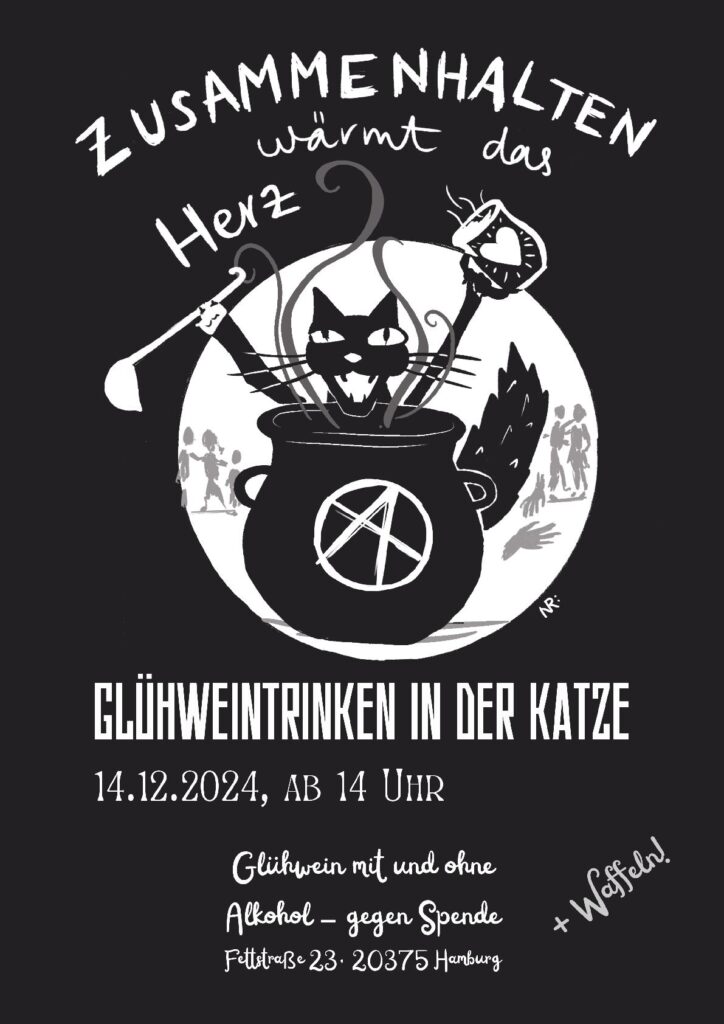 Kommt am 14. Dezember ab 14 Uhr in die Schwarze Katze – ein Raum des Widerstands und der Solidarität! In einer Zeit, in der Zusammenhalt wichtiger denn je ist, wollen wir uns mit heißen Getränken – mit und ohne Alkohol – und veganen Waffeln stärken und uns gegenseitig unterstützen. Hier gibt es keine Profitinteressen, sondern Raum für gemeinsames Handeln und Denken.