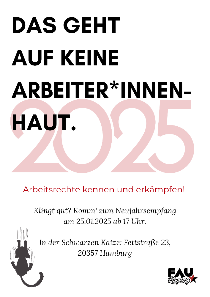 Um all diesen Misständen zu begegnen gibt es nur einen Ausweg: Die Arbeitenden im Baugewerbe organisieren sich über Staats-, Berufs- und Sprachgrenzen hinweg und kämpfen gemeinsam für bessere Arbeitsbedingungen ohne faule Kompromisse. Wenn du dich daran beteiligen willst dann komm zur Arbeitsgruppe Bau der Freien Arbeiter*innen Union Hamburg. Kontaktiere uns unter fauhh-bau@fau.org oder komm einfach unangemeldet am Bau-Freitag (immer am 3. Freitag im Monat ab 19:30 Uhr) bei uns in der Schwarzen Katze (Fettstrasse 23) vorbei.