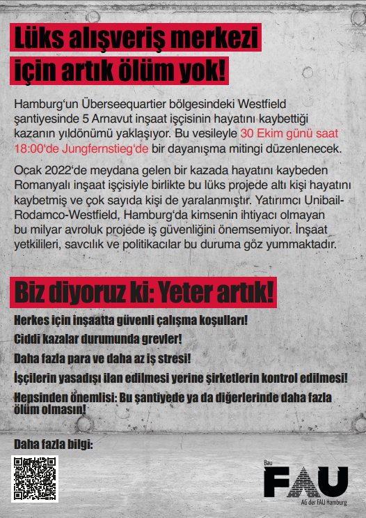 Hamburg’un Überseequartier bölgesindeki Westfield şantiyesinde 5 Arnavut inşaat işçisinin hayatını kaybettiği kazanın yıldönümü yaklaşıyor. Bu vesileyle 30 Ekim günü saat 18:00’de Jungfernstieg’de bir dayanışma mitingi düzenlenecek. Ocak 2022’de meydana gelen bir kazada hayatını kaybeden Romanyalı inşaat işçisiyle birlikte bu lüks projede altı kişi hayatını kaybetmiş ve çok sayıda kişi de yaralanmıştır. Yatırımcı Unibail-Rodamco-Westfield, Hamburg’da kimsenin ihtiyacı olmayan bu milyar avroluk projede iş güvenliğini önemsemiyor. İnşaat yetkilileri, savcılık ve politikacılar bu duruma göz yummaktadır. Biz diyoruz ki: Yeter artık!