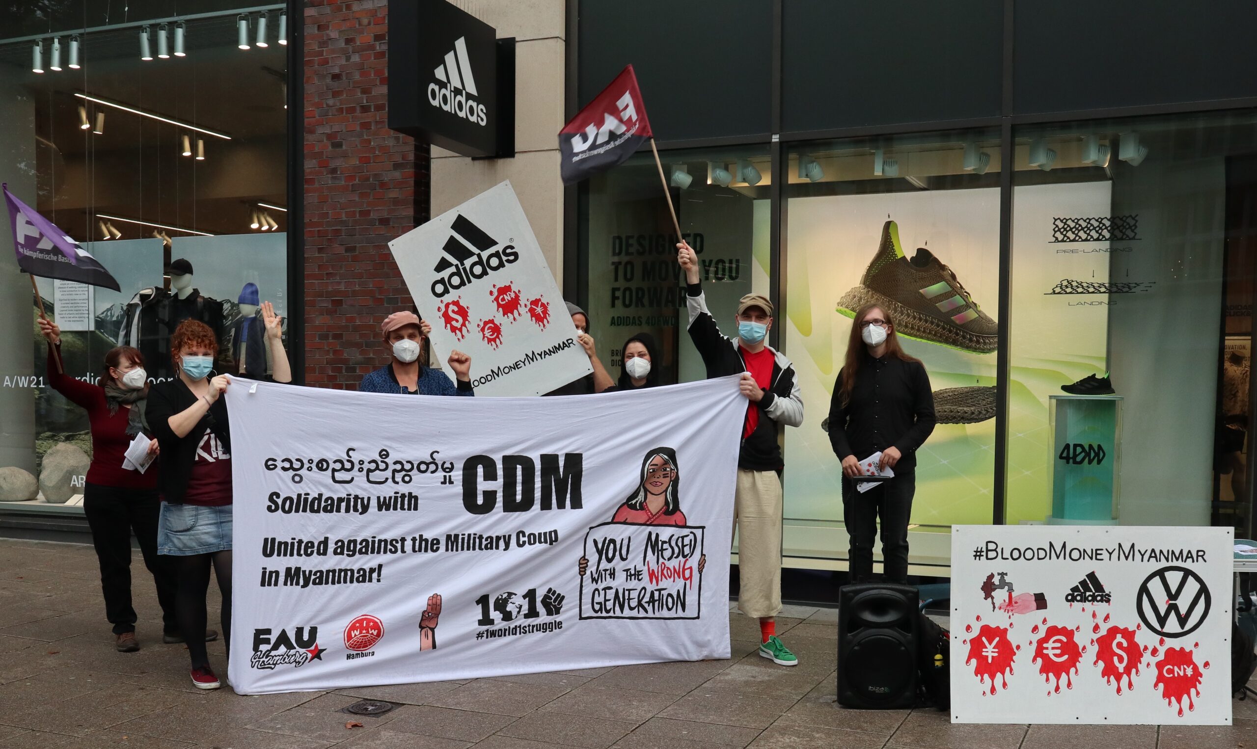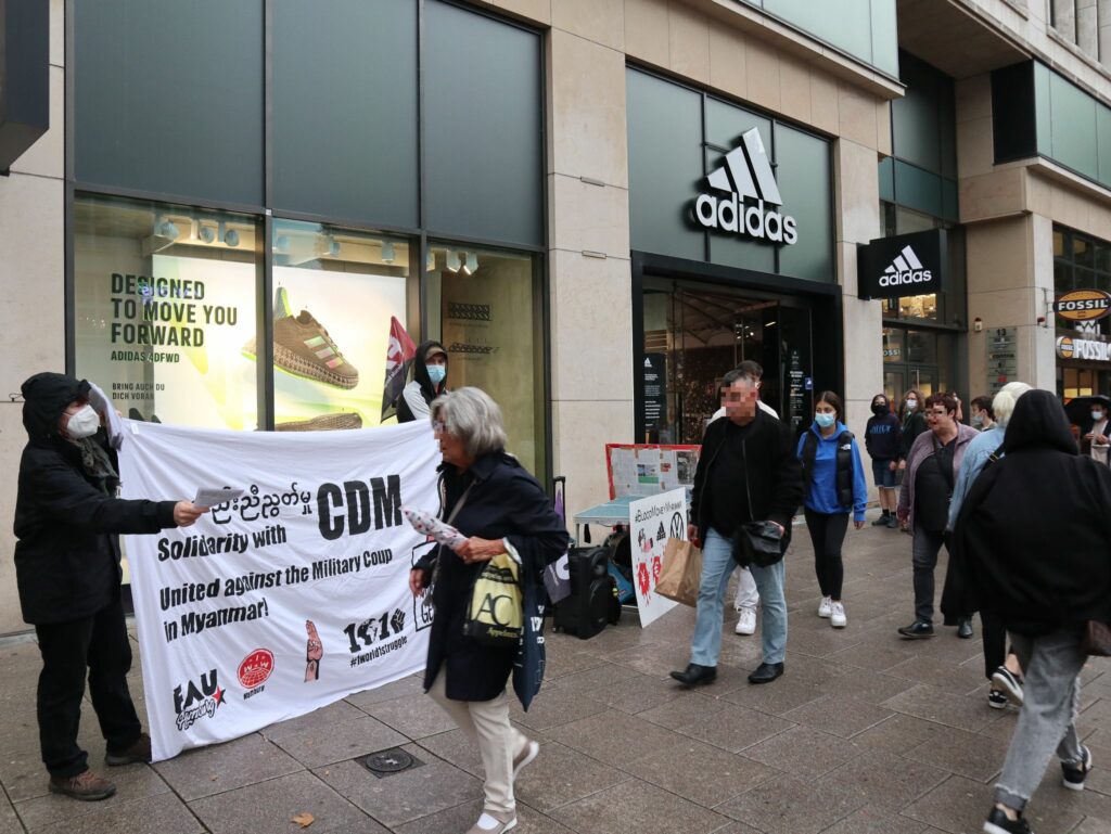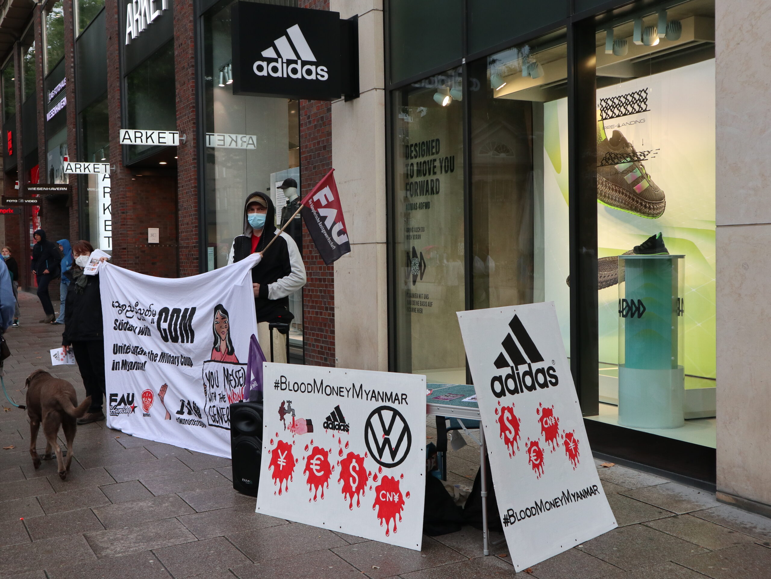 Wir erwarten von Adidas eine öffentliche Stellungnahme! Das Unternehmen bezieht weiterhin Klamotten aus sechs Fabriken in Myanmar und betreibt Läden in dem Land. So lange die Militärdiktatur herrscht, ist das nicht akzeptabel.