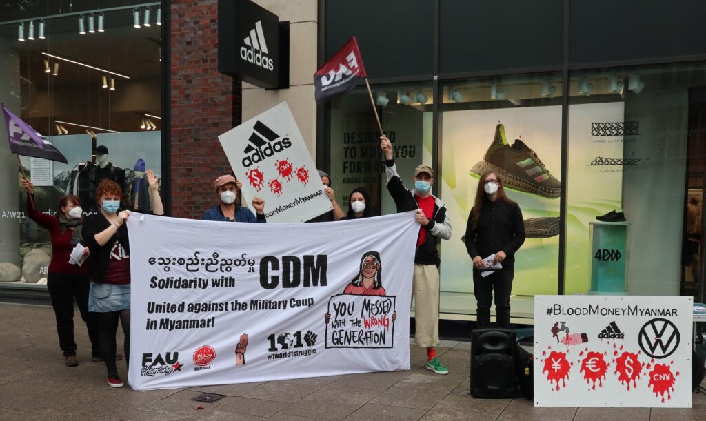 Um der Militärjunta die Finanzquellen abzuschnüren, haben Akteur*innen der Zivilgesellschaft sowie die FGWM die Blood Money Campaign initiiert. Mit dieser sollen Unternehmen, die weiterhin in dem Land Geschäfte betreiben und somit auf direkte oder indirekte Weise das Militär finanziell unterstützen, unter Druck gesetzt werden, ihre Investitionen abzuziehen. Neben Firmen wie der Deutsche Post DHL Group, Primark, H&M und Volkswagen, gehört auch Adidas dazu.