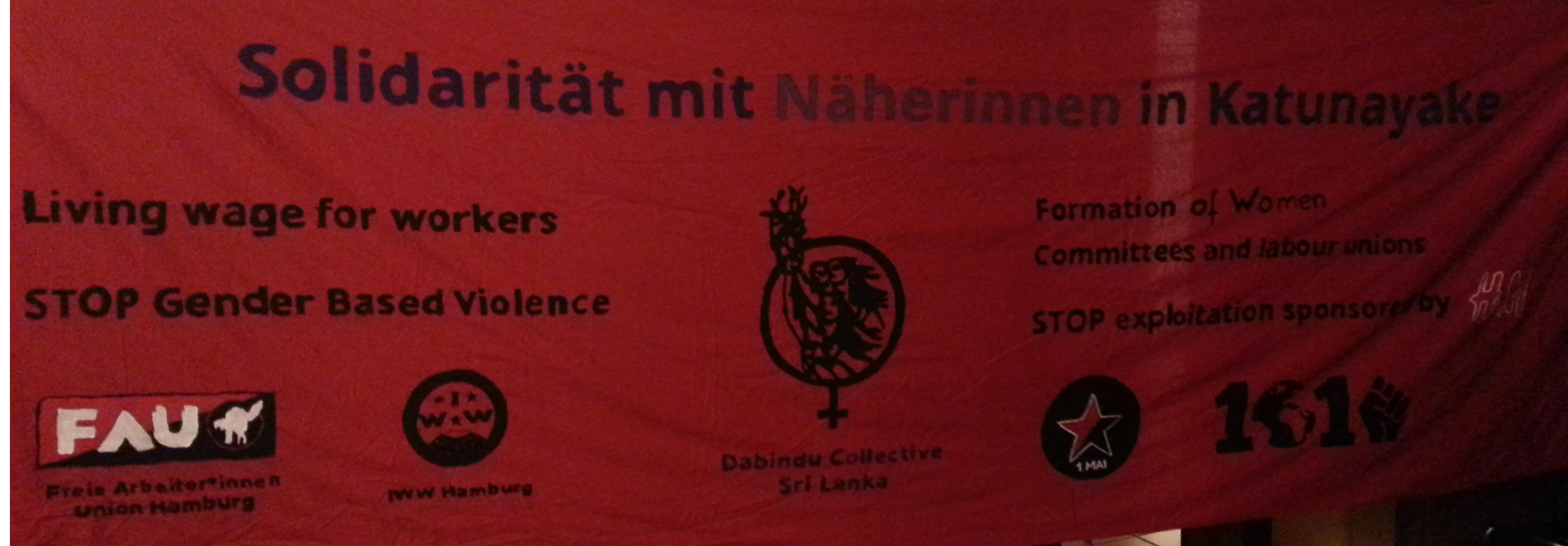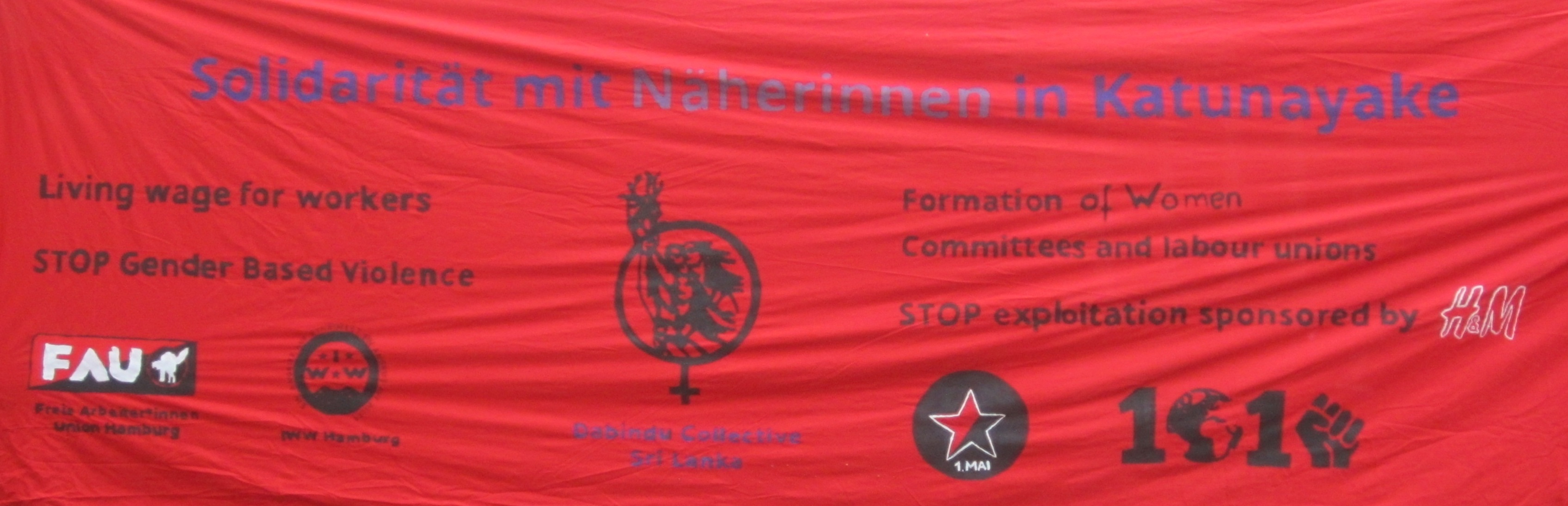 Wir nehmen das gemeinsam mit der IWW (Industrial Workers of the World) Hamburg, ATIF (Föderation der Arbeiter*innen aus der Türkei in Deutschland) und dem AStA (Allgemeiner Studierendenausschuss) der Uni Hamburg zum Anlass uns insbesondere gegen die Arbeitsbedingungen bei H&M (Stichwörter: Werkverträge, Outsourcing, Zeitdruck, Service-Industrialisierung), aber auch dem Einzelhandel im Allgemeinen zu positionieren. Selbstverständlich nicht ohne die Wertschöpfungskette dahinter hervorzuheben. Das Dabindu Collective, in dem Näherinnen in Sri Lanka organisiert sind, hatte erst am 08.12. eine Kundgebung gegen sexuelle Belästigung am Arbeitsplatz sowie grundsätzlich für bessere Arbeitsbedingungen mit existenzsichernden Löhnen durchgeführt. Wir solidarisieren uns mit ihren Forderungen!