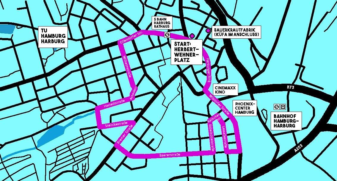 Start: 12:30 Uhr (Herbert-Wehner-Platz; gleich neben der S-Bahn Station Harburg Rathaus) Hier gibt’s die Route. Anschließend Küfa (Küche für alle) in der Sauerkrautfabrik.