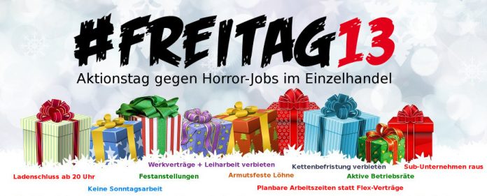 Die Aktion gegen Arbeitsunrecht ruft dazu auf, am Schwarzen Freitag, 13. Dezember 2019 gegen Horror-Jobs im Einzelhandel zu protestieren und Solidarität mit den Beschäftigten in Supermärkten, Warenhäusern und Filialen zu bekunden.