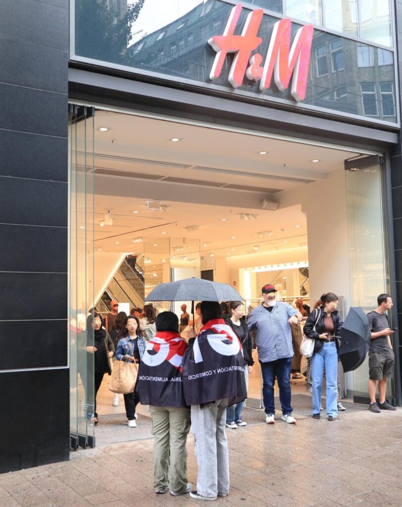 Um den Druck im Zusammenhang mit dem Streik zu erhöhen, machten sich fünf betroffene Genoss*innen der CGT auf die Reise. Zunächst für eine Kundgebung vor dem H&M Geschäft in der Spitalerstraße am 23.07.2024. Warum ausgerechnet dort? In der Spitalerstraße befindet sich die landesweite Geschäftszentrale. Außerdem stellt Deutschland für H&M den größen Absatzmarkt dar. Spontan schlossen sich mehrere Mitglieder der FAU Hamburg, FAU Lüneburg und FAU Lübeck der Kundgebung vor dem Geschäft in der Spitalerstraße an und trotzten gemeinsam mit dem Besuch aus Barcelona dem hamburger Schietwetter während die kaufwütige Öffentlichkeit mit Flyern und Banner über den Arbeitskampf informiert wurde.