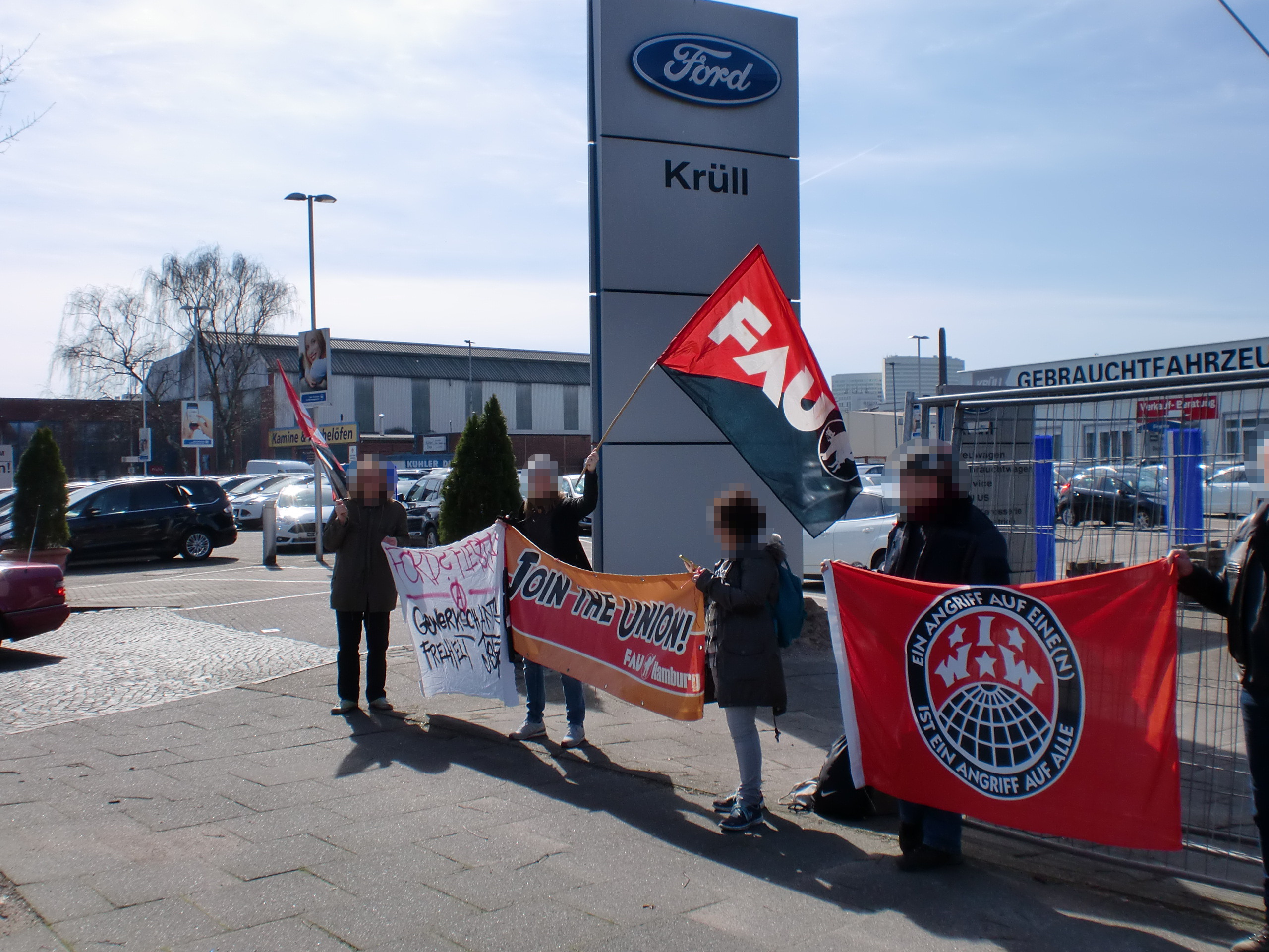 Heute, am Samstag dem 25. März 2017, hat die Freie Arbeiter*innen Union (FAU) Hamburg zusammen mit den Industrial Workers of the World (IWW) und unterstützt von der Grupo de acción sindical (GAS) eine Solidaritätskundgebung vor einem Ford-Autohaus abgehalten und die Wiedereinstellung eines Gewerkschaftsvertreters der Confederación Nacional del Trabajo (CNT) in Valencia gefordert.